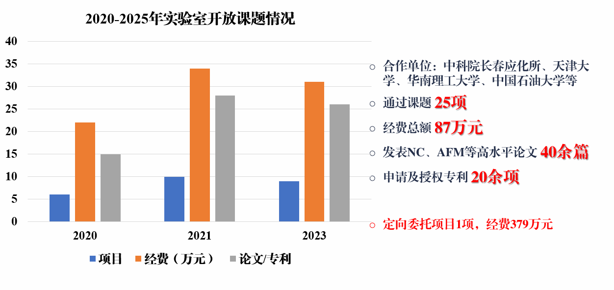 实验室定期发布开放课题和定向委托项目,围绕氢能利用、碳中和、储能等国家重大战略需求制定指南,共收到来自中科院长春应化所、天津大学、华南理工大学、中国石油大学等知名院校38份申报书,经评审立项开放课题9项和定向委托项目1项,资助经费共379万元。开放课题和定向委托项目显著促进了实验室在液体储氢技术、热泵辅助储热技术、木质素产物催化制氢技术、生物质高值化利用、固态储氢材料、电致可控相变材料及燃料电池膜材料等领域,合作发表高水平论文40余篇,促成双方人员互访20余次,为双方科研人员搭建了宝贵的交流合作平台。